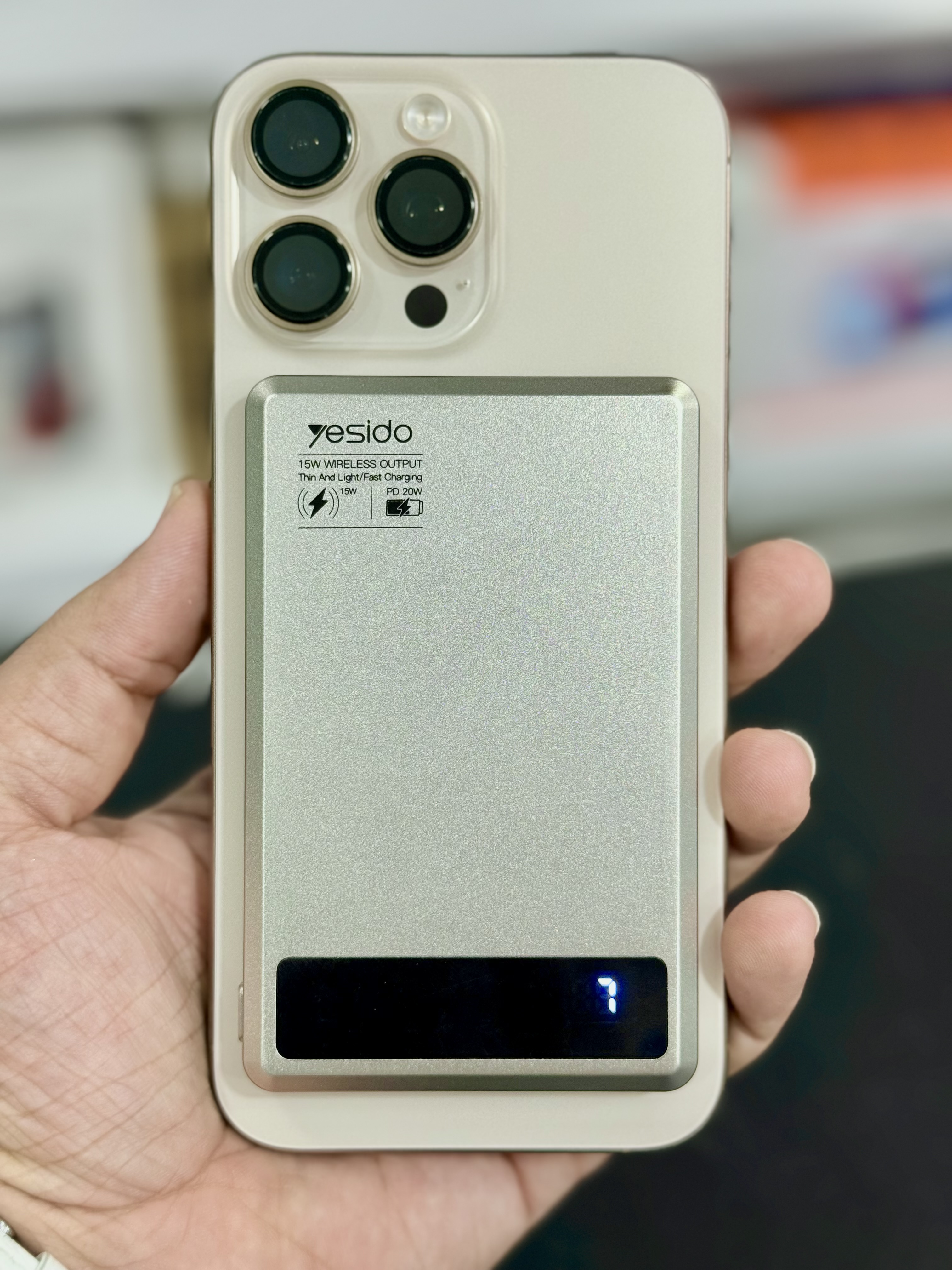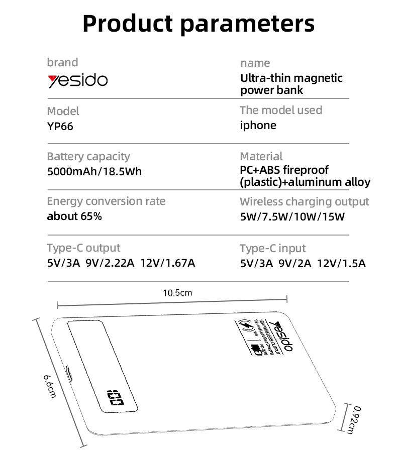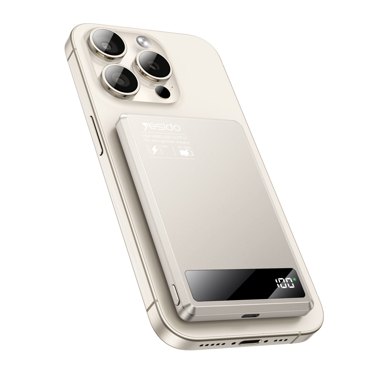 پاوربانک Yesido YP66 با ظرفیت 5000 میلیآمپر ساعت طراحی شده تا به کاربرانی که به دنبال یک شارژر همراه کمحجم، سبک و چندکاره هستند، گزینهای مطمئن ارائه دهد. این مدل علاوه بر شارژ سیمی، از قابلیت شارژ بیسیم (Wireless Charging) نیز پشتیبانی میکند — تا حداکثر توان 15 وات — که آن را برای استفاده با گوشیهای دارای پشتیبانی MagSafe یا Qi بسیار مناسب میکند. ساختار مگنتی بدنه کمک میکند گوشی را بهراحتی روی بدنه چسبانده و بدون اتصال کابل، شارژ شود.