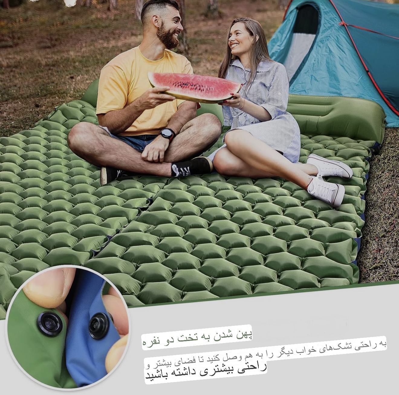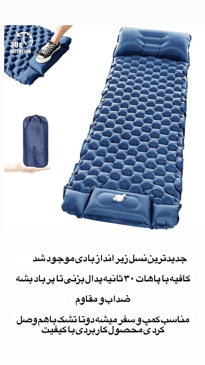 جدیدترین نسل زیر انداز بادی با قابلیت پر شدن سریع، ضدآب و مقاوم مناسب کمپ و سفر. امکان اتصال دو تشک با هم.