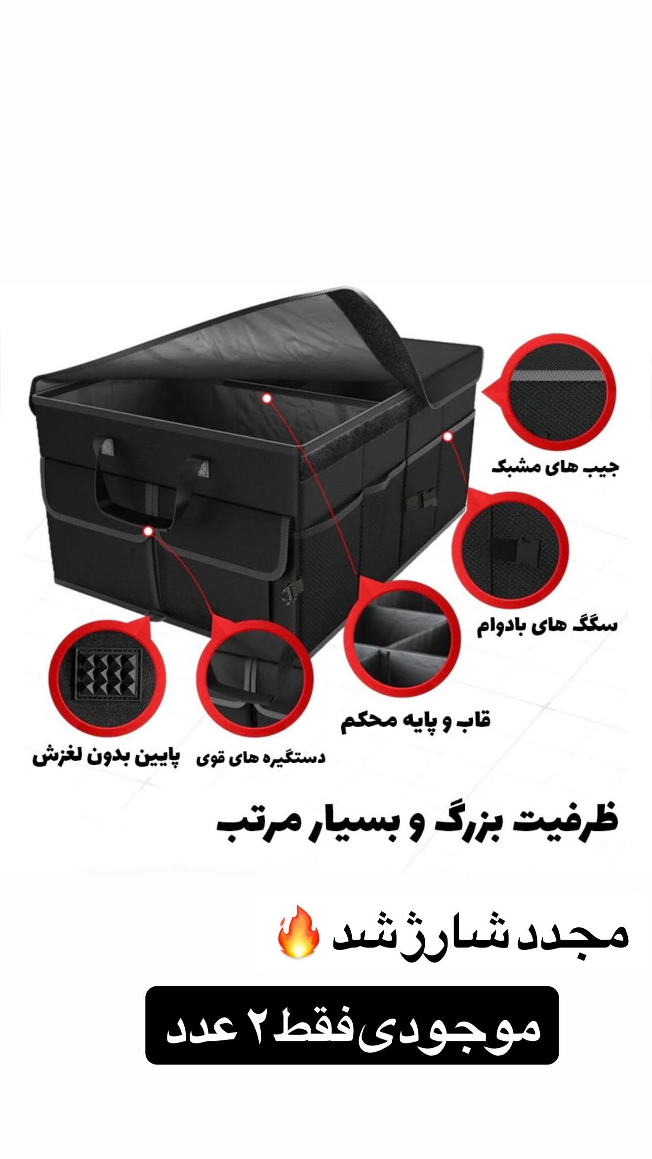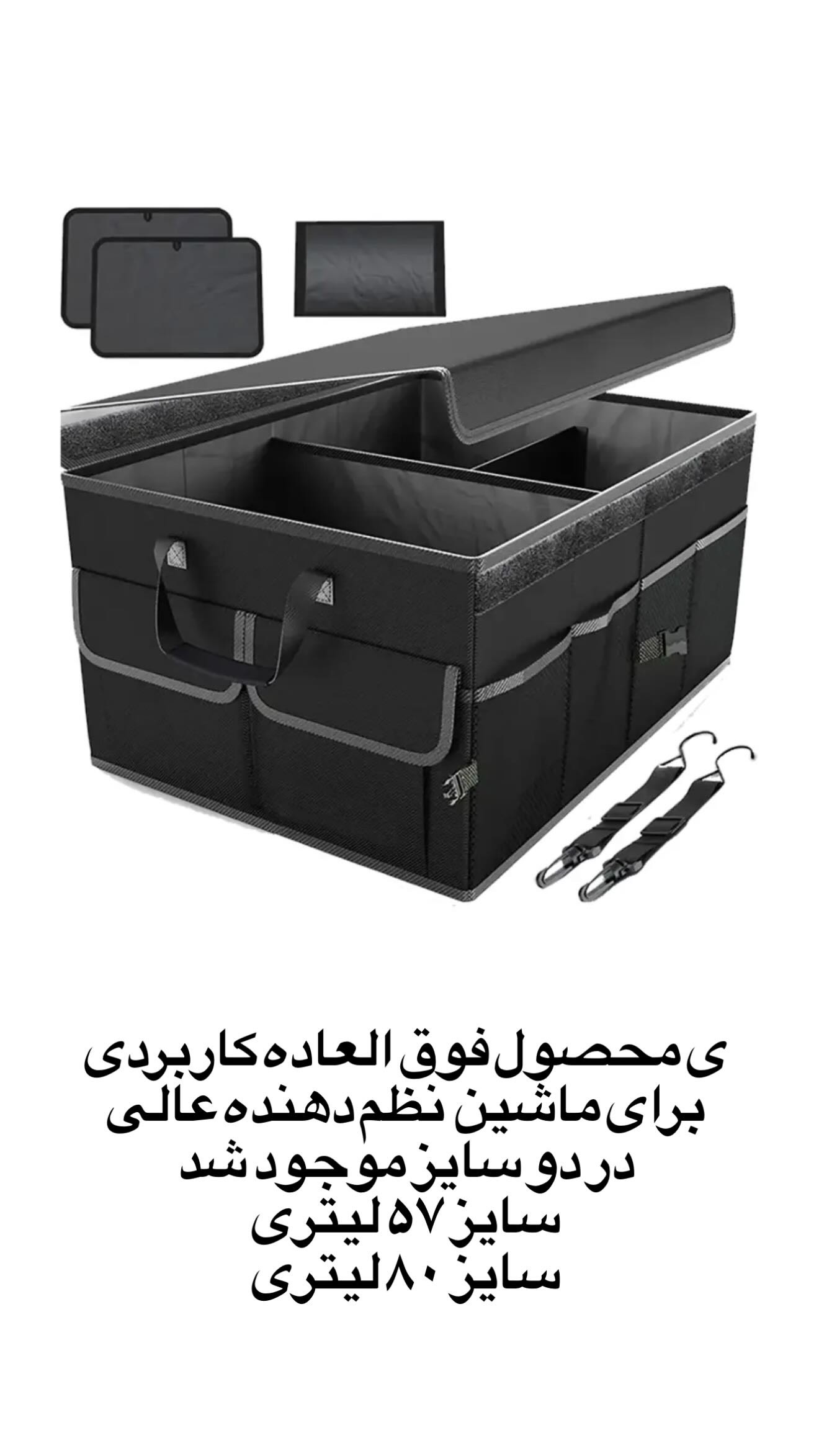 جعبه برزنتی نظم دهنده صندوق عقب انواع خودرو دارای دستگیره کناری برای حمل و جابجایی راحت ظرفیت 57 تسمه هاى قابل تنظيم و روكش جدا شونده براى پايدار ماندن در صندوق عقب ببنديد طراحى جعبه محكم ومرتب با دوام وآسان در نصب صندوق عقب شمارا هميشه مرتب نگه ميدارد.