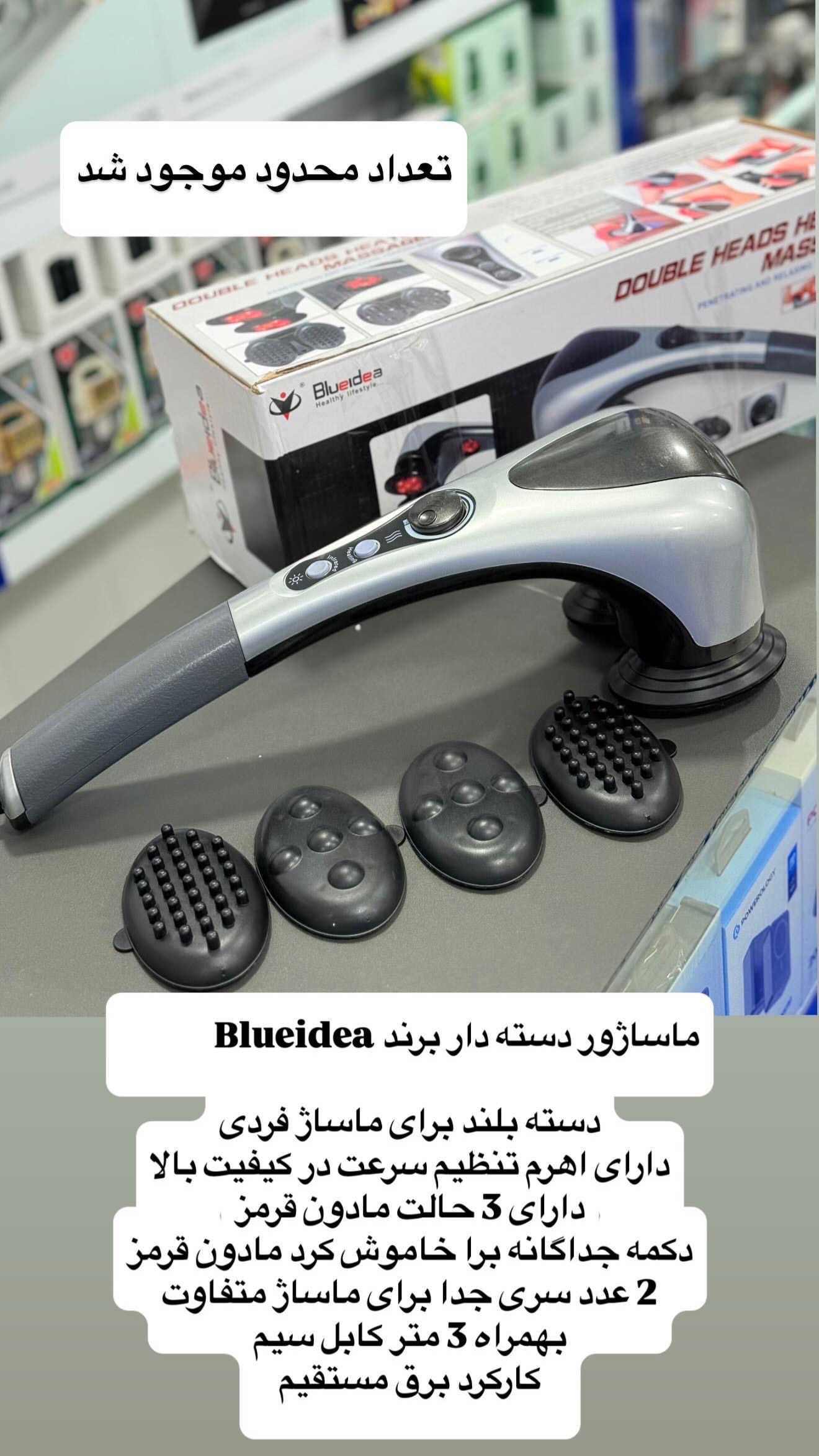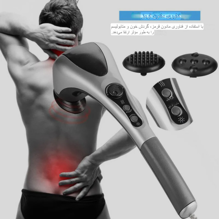 ماساژور دسته دار با اهرم تنظیم سرعت و دارای ۳ حالت مادون قرمز و دکمه جداگانه برای خاموش کرد مادون قرمز. شامل ۲ عدد سری جدا برای ماساژ متفاوت.
