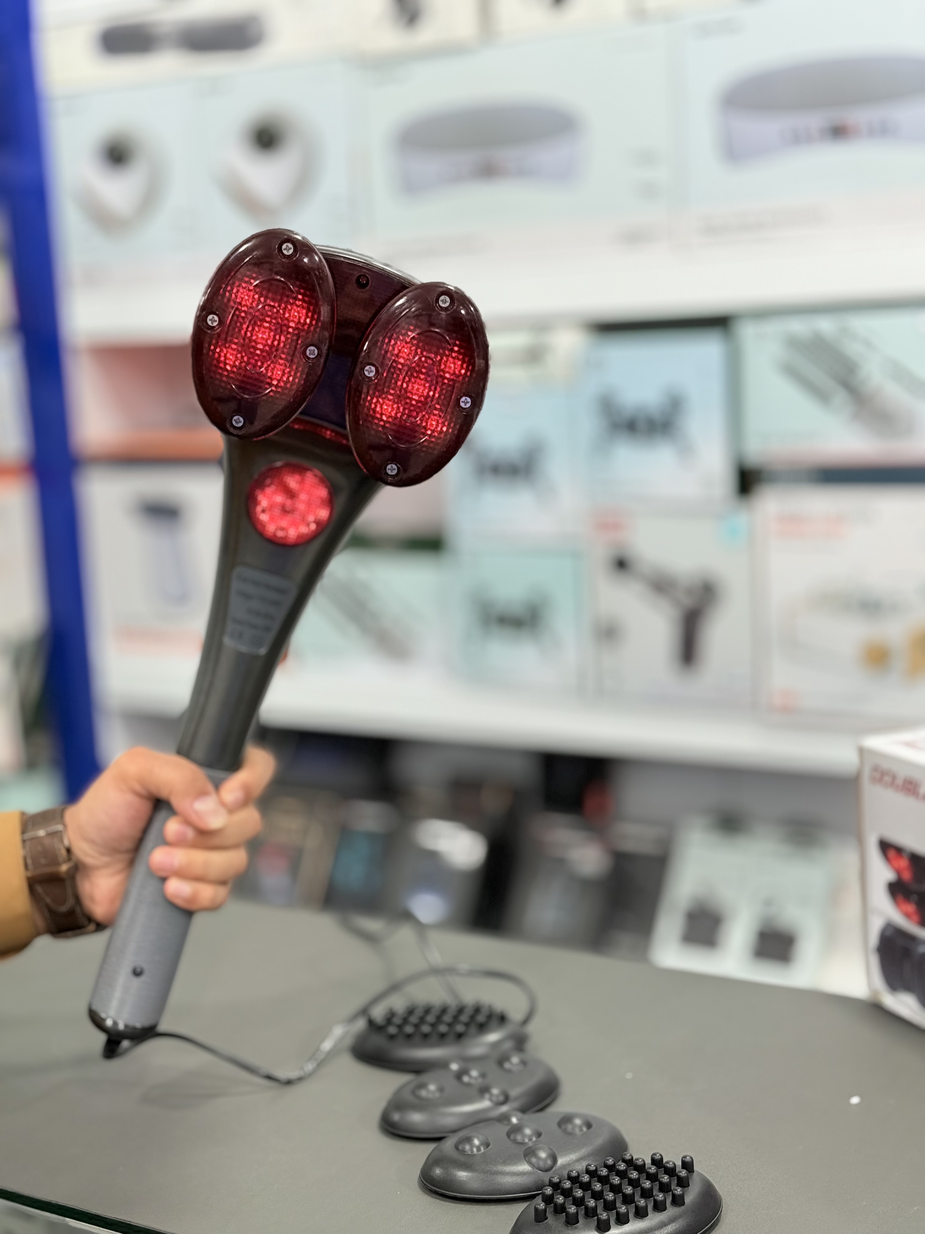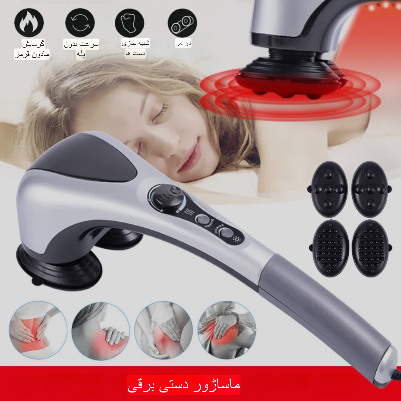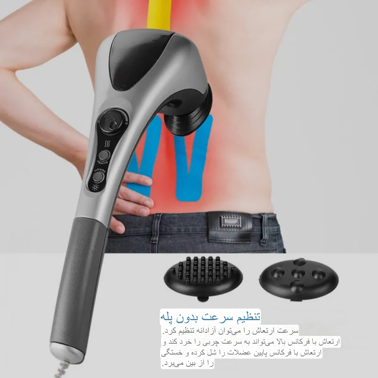 ماساژور دسته دار با اهرم تنظیم سرعت و دارای ۳ حالت مادون قرمز و دکمه جداگانه برای خاموش کرد مادون قرمز. شامل ۲ عدد سری جدا برای ماساژ متفاوت.