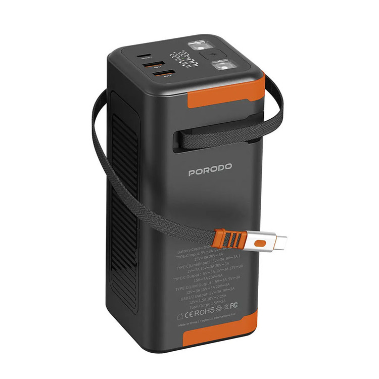 Porodo Power Boost 50000mAh Power Bank with Retractable Type-C Cable - Black